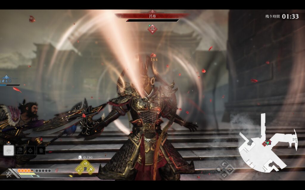 なんなら肉まんも壺を全部割って使い果たしましたからね。ここでも見失うスキルを発揮してしまい(相手はたった2人なのに見失う)なるべく2人まとめて巻き込んでいきたいのに離れちゃうし仕方なく貂蝉を叩いていたら呂布の攻撃を避け損ねて死にそうになってました。