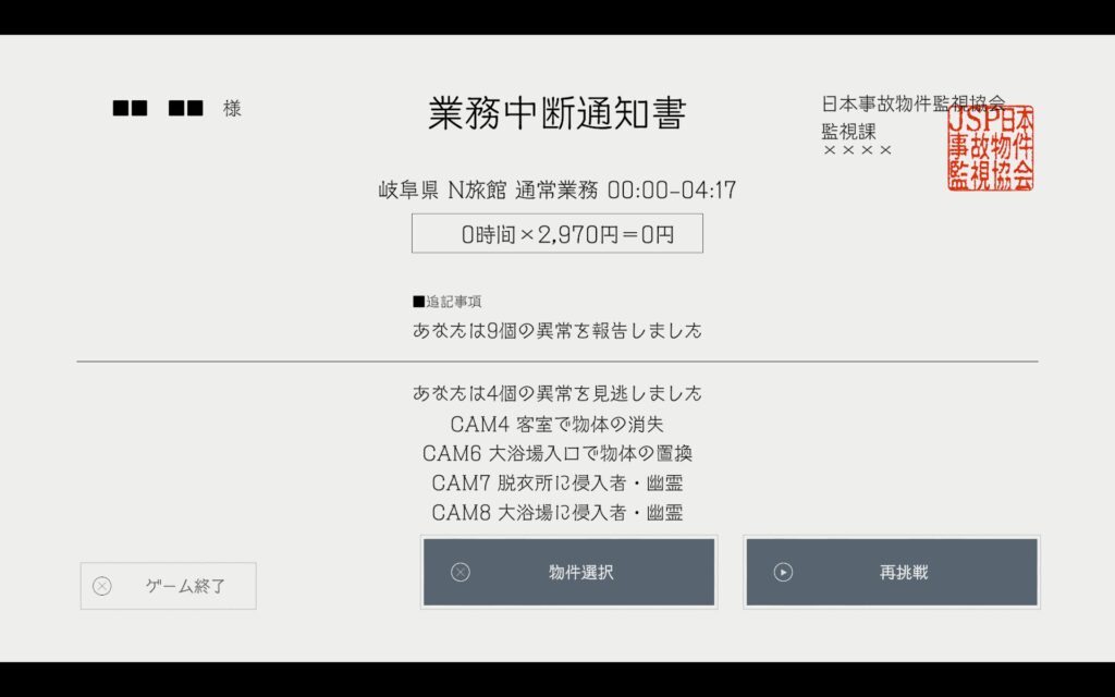 既に実況プレイ配信や動画をいくつか見た後なので大体どんな異常が起きるか知ってしまっている状態でのプレイになりましたが、A邸やT神社はテンポよくクリアしつつN旅館では2回業務中断させられました。中断って言うかこれ殉職……絶妙に物が増えたり減ったりの異常が紛らわしいステージですよね、この旅館。