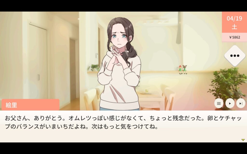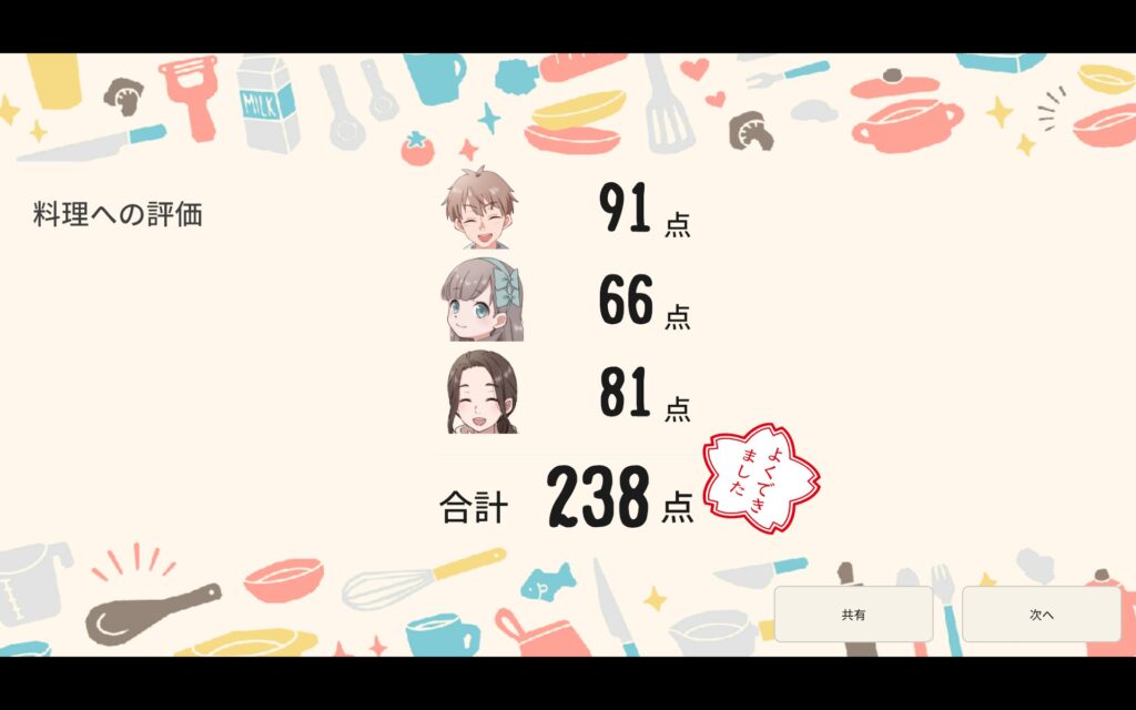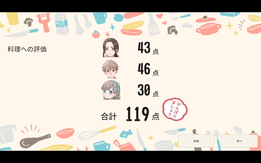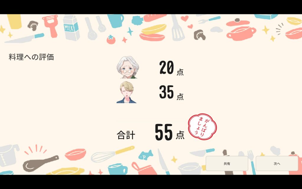 「料理は自分に向いてないのかもなあ」というバッドエンド風味の会話が挟まりました、これはつらい……ただその後に「でも私も最初は失敗ばかりだったのよ」と励ましてくれる娘の言葉でこれからも料理を続ける決意をするので一応締めは同じになるようです。流石にここで心折れて終わりはあまりにあんまりですからね!