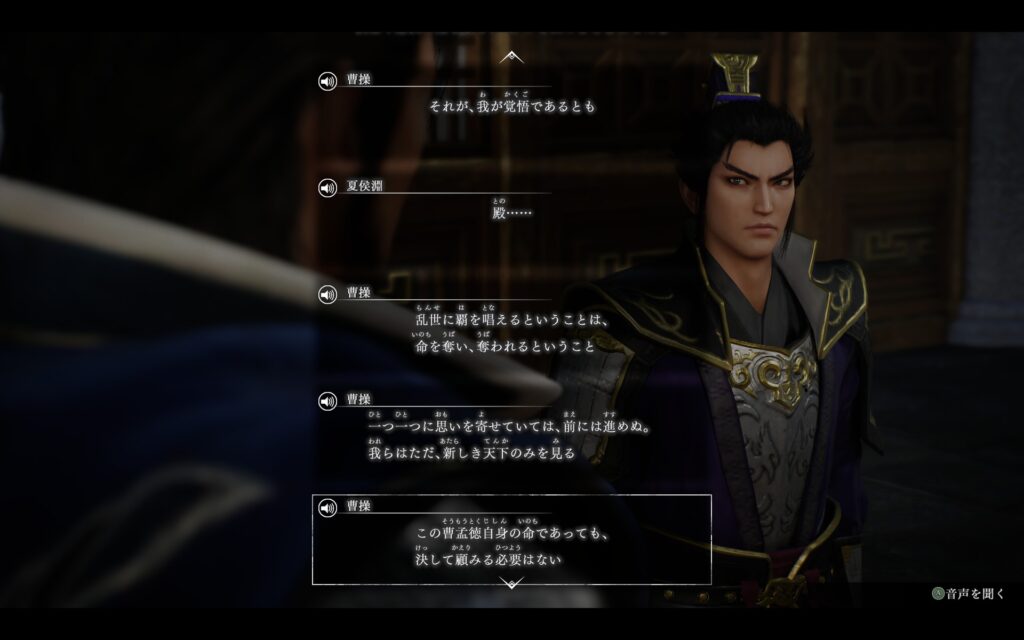 宛城は流石に1周目で典韋の天命変化は無理だったんですが、戦後のやりとりでDLC袁紹ルートで自分を悪として斬るよう袁紹に繰り返し迫っていた曹操を思い出しました。ここで言う「我ら」は自分や自分の軍に限らないってことなんですかね、かっこいいな。