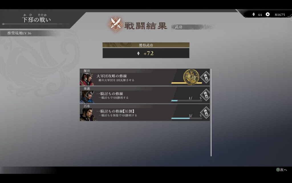 そして一騎打ち系の修練が毎回残るんですよね、特に無傷で勝つのはうっかり避け損ねて駄目になってしまったり(そして龐統にお金を積んで呂布と仲良くさせてもらう)