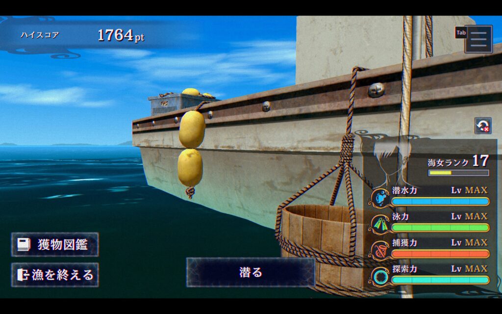 よし。でもスコア2000狙いたいなあ。ランク上げてアワビや伊勢海老をクリティカルで仕留めながら長く水中にいればいいんでしょうか。