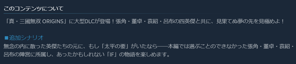 ここあたりの勢力に所属できたらいいなーでも董卓あたりは涼州の風が腰を落ち着けるのって解釈違いじゃないかなーとか思ってたんですが……いいんだな!? 張角を助けて戦いたいけど大平の要1人いる程度で組織の腐敗をどうにかできるとも思えない……とか考えずに突っ走っていいんだな!? 欲しいもの全部入りじゃないですかこんなの! 追加武器と随行武将の追加も楽しみですね、朱和や貂蝉と戦えるのもめちゃくちゃ嬉しいんですが(どっちも剣のイメージで私も剣をよく使うのでめちゃくちゃ被る気がした)勢力ごとの所属武将もいればなもっと嬉しいなあ……董卓配下なら華雄連れていけたりしませんかね、駄目ですかね!? トレーラーにいた見知らぬイケオジがどなたなのか大変気になります。