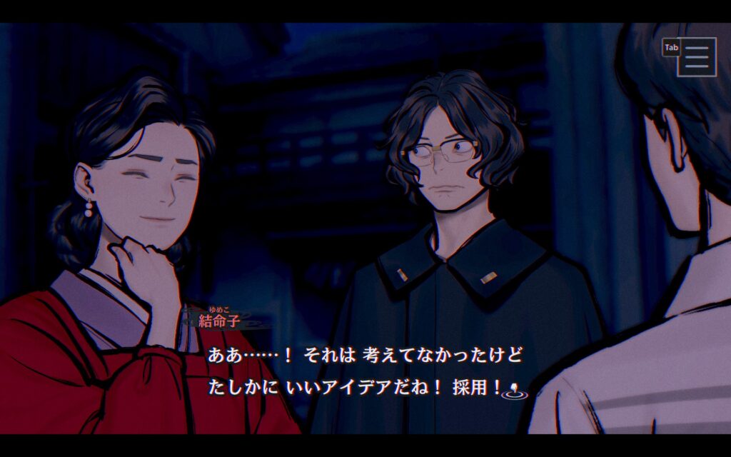 メインのストーリーとしては亀島の中で起きる8月7日の出来事を中心とした物語で、それにまつわる歴史や言い伝えの類の情報を埋めていくのに追想が結命子ルートやアヴィルートでもりもり入る感じでしたね。青春伝奇な亀島組パートも好きですし、情報を集めていくおかみさんやアヴィのパートも「うわあこの情報あっちに伝えたい!」「これそういうことだったのか!」の面白さがあってどちらも楽しめました。前作同様後半の怒涛の展開や悲劇を回避するべくみんなで奔走する勢いは興奮しますね! ここで流れるBGMもギターバリバリのカッコイイ曲なのがテンションを上げてきます。